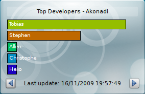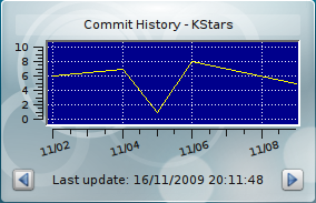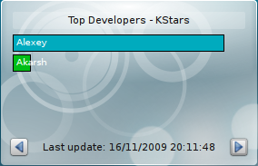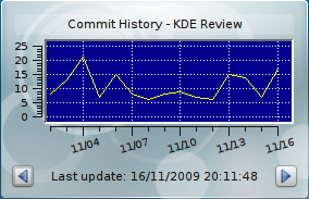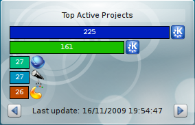 The KDE Observatory is a new plasmoid for visualizing general information about KDE projects. Currently it provides four different views: Top Active Projects, Top Developers, Commit History, and Krazy Report.