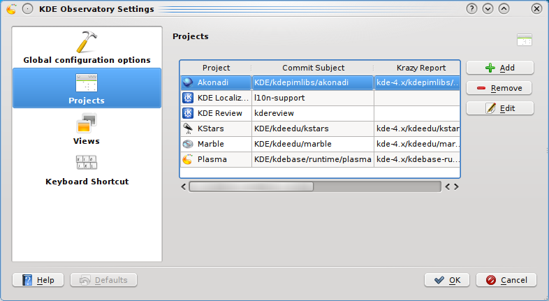 The KDE ObservatoryKeeping track of statistics and metrics in software development projects is not rarely a requisite activity for early evaluation of risks, quality management, and successful delivery of functionalities. KDE community provides amazing tools for such activities: commits bots, Krazy analysis, bug tracking, review board, mailing lists, etc. Why not bring these resources together in an integrated tool ? Even better, why not all those information right on your desktop ? :) That's the KDE Observatory. The great (and sadly - and understandably - inactive) work done by Danny in KDE Commit Digest boosted me to begin that implementation two weeks ago.