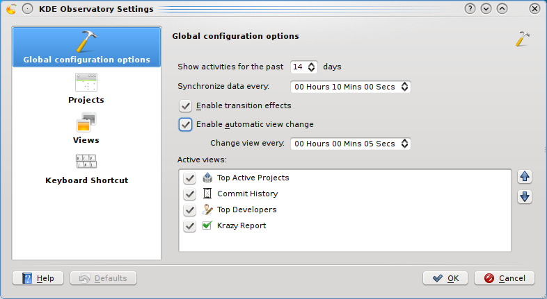 In general setting you can set up parameters for the commit extent (to collect commit in the last m days), commit and Krazy synchronization delay, enable/disable automatic view change, and enable/disable a fancy sliding effect when changing views. Also on that configuration page, you are able to enable/disable a specific view type and define the appearance order.