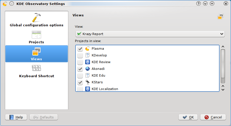 In the Views page you select the desired projects to be processed in a per-view basis, so that you can display a Krazy Report for KDevelop but not for Plasma, for example.