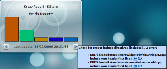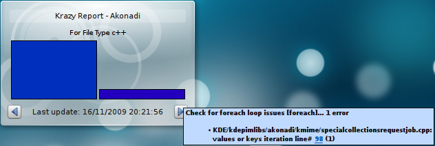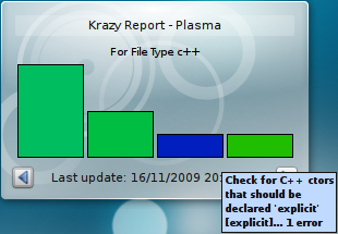And, last but not least, my preferred one: Krazy Report. If you are all like me you hate that annoying compilation warnings and Krazy complains that say: "It's ok, but you can do better !" :) So, now there is no need for a Krazy check at www.englishbreakfastnetwork.org, all information can be found in KDE Observatory. Yes, you'll have an annoying notification in your panel soon :). Development was architected to seamless support future views, such as bugs visualization.