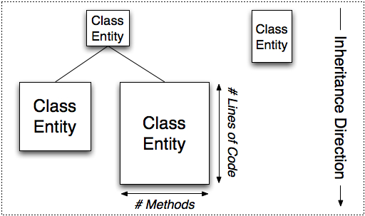 The polymetric visualization paradigm has been successfully implemented in the Malnati’s X-Ray project and constitutes a major feature for metric-based program comprehension. In such approach class hierarchies are represented by connected rectangles and metrics extracted from source-code define the values of geometric parameters used in the visualization. Figure 3 shows a polymetric view where the width of the rectangle represents the number of methods implemented in that class, while the height of the rectangle represents the number of lines of code (LOC) of the whole class.