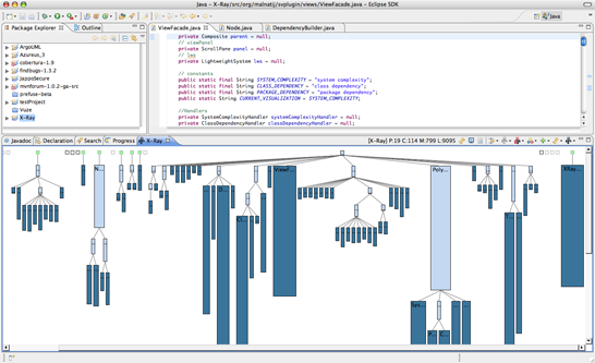 As I've mentioned before, the goal is to implement two well-known static visualization paradigms: control flow graphs and polymetric visualization. Control flow graphs should provide a direct, interactive and configurable visualization of control flow between functions, classes, and modules, whereas polymetric visualization aims at representing software metrics as easily assimilated visual pictograms. We think these features can enhance program comprehension and set the stage for advanced visualization mechanisms, such as architecture discovery and requirements tracking.